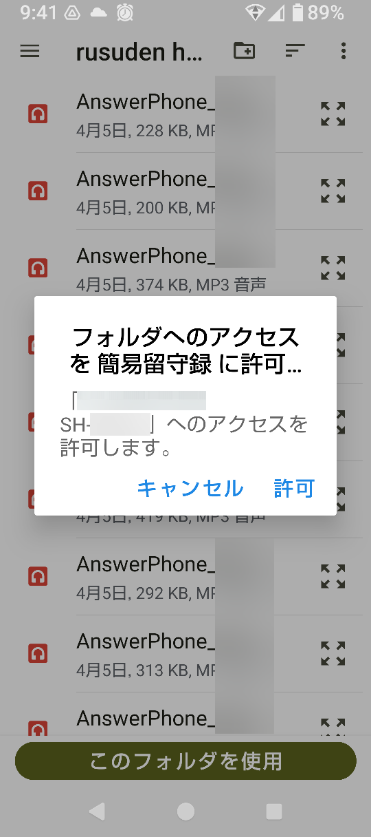 ⑤、(フォルダへのアクセスを簡易留守録に許可)のダイアログが出るので許可をタップ。